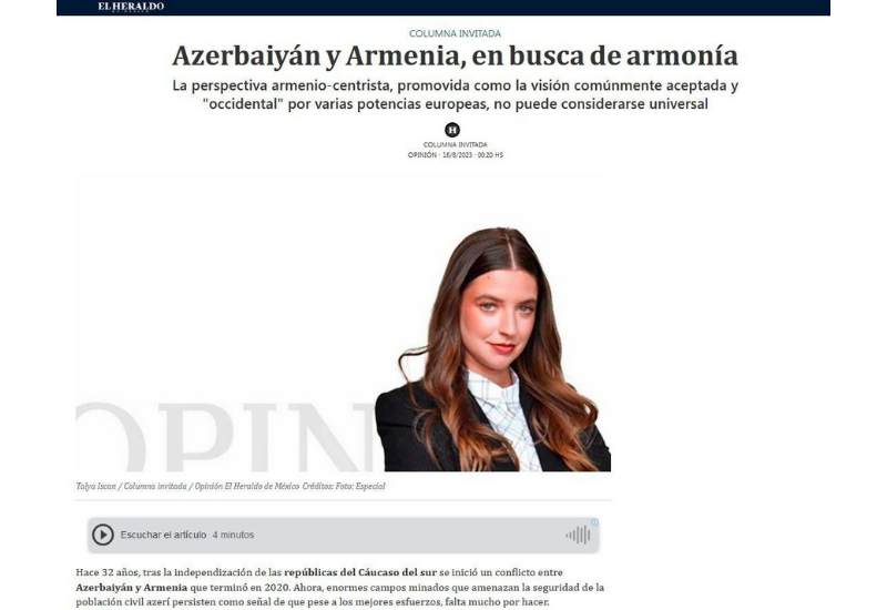 An article titled "Azerbaijan and Armenia in Search of Harmony" was published in the electronic and printed versions of the popular Mexican newspaper "Heraldo de Mexico". The article emphasizes that, despite the end of the long-term occupation of the lands of Azerbaijan in 2020, the presence of illegal armed groups of Armenia in the Garabagh region of Azerbaijan seriously threatens peace and security in this region. It is noted that the mine terror carried out by Armenia poses a great threat to the civilian population, hinders the return of people to normal life, the restoration of cities and infrastructure, Azernews reports, citing Day.az, the russian-language analytical news website.