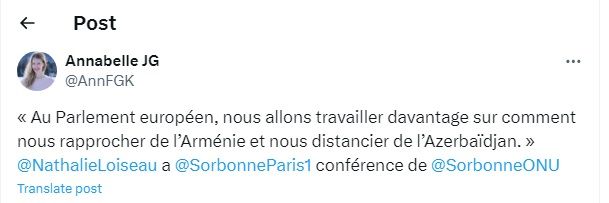 Every enterprise operating in France, from an ordinary organization, firm and service centers to political circles, actively carries out anti-Azerbaijani activities. Annabelle JG, founder of FAMA and Chief Representative of SEFB, made a post on her X social page calling for the European Union to completely distance itself from Azerbaijan and be closer to Armenia.