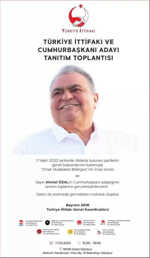 Technology Development Party (TEK Party) Chairman Ahmet Ozal has become the presidential candidate of the Turkiye Alliance, made up of seven political parties. Ahmet Ozal's candidacy will be announced at a press conference.