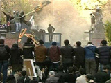 Members of the Basij militia attend a military parade to mark Basij week in front of the former U.S. embassy in Tehran Nov 25. Iranian protesters entered the British embassy compound in Tehran today and removed the mission's flag, replacing it with an Iranian one, an AFP journalist at the scene reported.