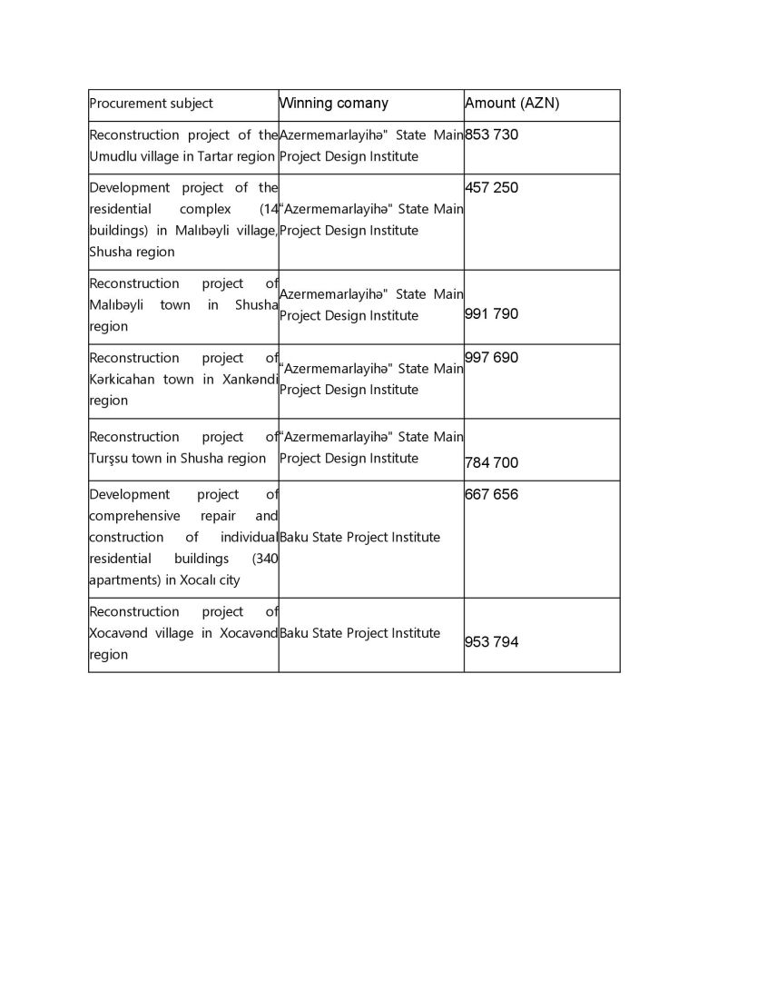 "Azermemarlayih?" State Main Project Design Institute won 5 of the tenders, while the remaining 2 were secured by the Baku State Project Institute, Azernews reports.