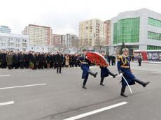 A guard of honor was lined up and flowers were laid near the memorial, located at Khatai district.