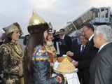 The Head of State was welcomed at the Kazan`s international airport by President of Tatarstan Rustam Minnikhanov and other officials.