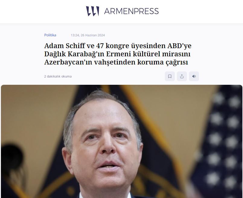 For a long time, U.S. Congressman Adam Schiff, who has been working to satisfy the Armenian lobby, has launched yet another move. In June, Schiff and a bipartisan group of 47 of his colleagues sent a letter to Secretary of State Antony Blinken, calling on the U.S. to "prioritize the protection of Armenian heritage at risk in "Nagorno-Karabakh" in all future diplomatic contacts with Azerbaijani officials.