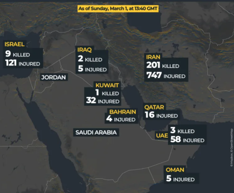 Here’s the latest on how many people have been killed in the Middle East since joint US-Israel attacks on Iran were launched on Saturday, AzerNEWS reports via Al-Jazeera: