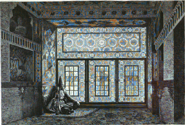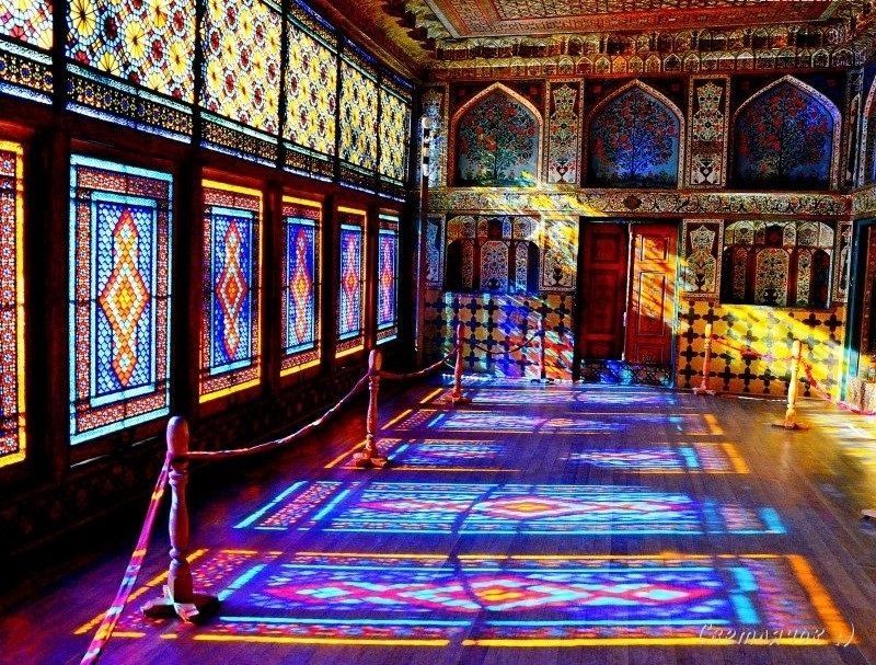 The summer residence is renowned for its majestic interior. Large portions of the facade of the residence, including the entire southern elevations of the central halls on both floors, are covered by a mosaic of colored glass set in a wooden latticework (shabaka).