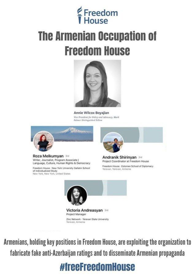 Take up Freedom House, which conducts anti-Azerbaijani research, for example. An organisation chart of Freedom House has been circulated on the internet recently. The vice president in charge of policy and the defence of rights, Annie Wilcox-Boyajan, curator of projects "for the development of democratic culture," Roza Melkumyan, project manager Andranik Shirinyan, and Victoria Andrksyan and so on. Thus it is obvious why this organization makes groundless statements against Azerbaijan.