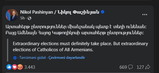 “Early elections must definitely take place. But early elections for the Catholicos of All Armenians,” Pashinyan wrote on Facebook.