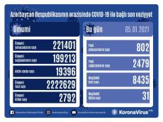 By Ayya Lmahamad Azerbaijan registered 802 new COVID-19 cases in the past 24 hours, Operational Headquarters under Cabinet of Ministers reported on January 5. Some 2,479 patients have recovered and 31 patients have died in the reported period. So far, 221,401 COVID-19 cases have been registered in the country. Some 199,213 patients have recovered, 2,792 people have died. Currently, 19,396 people are under treatment in special hospitals. Over the past day, 8,435 tests were conducted in Azerbaijan to reveal coronavirus cases. In general, 2,222,629 tests have been conducted in Azerbaijan so far.