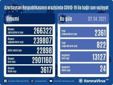 By Ayya Lmahamad Azerbaijan registered 2,361 new COVID-19 cases in the past 24 hours, Operational Headquarters under Cabinet of Ministers reported on April 2. Some 822 patients have recovered and 24 patients have died in the reported period. So far, 266,322 COVID-19 cases have been registered in the country. Some 239,807 patients have recovered, 3,617 people have died. Currently, 22,898 people are under treatment in special hospitals. Over the past day, 13,127 tests were conducted in Azerbaijan to reveal coronavirus cases. In general, 2,901,160 tests have been conducted in Azerbaijan so far.
