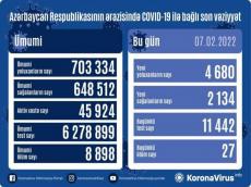 Azerbaijan registered 4,680 new COVID-19 cases in the past 24 hours, Operational Headquarters under Cabinet of Ministers reported on February 7.
