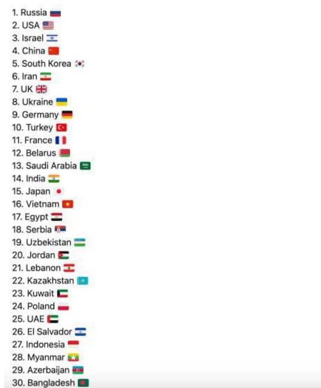 It should be noted that Bangladesh is ranked 30th, Colombia 31st, Canada 32nd, and Italy 34th on the list. Armenia and Georgia are not included in the ranking.